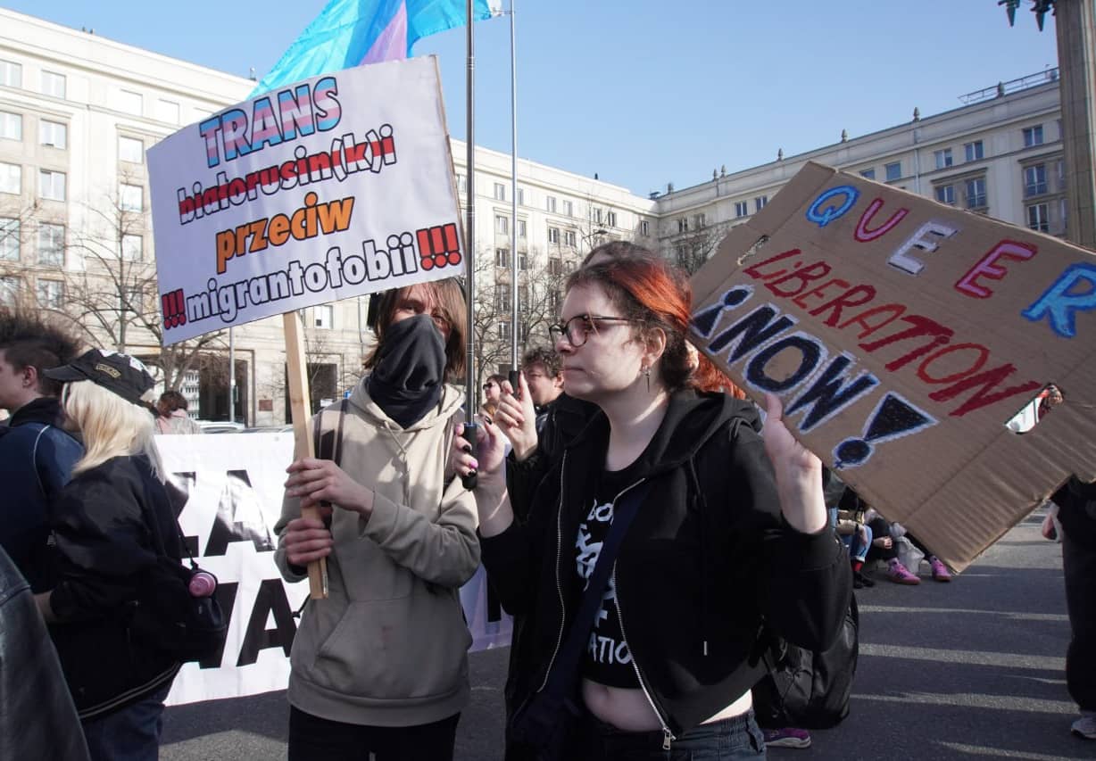 8 марта в Варшаве прошла ежегодная феминистская демонстрация «Манифа». Она традиционно собирает тысячи людей, которые выходят на марш за равенство, права женщин и социальную справедливость. В этом году в демонстрации приняли участие и трансгендерные беларус_ки — активист_ки TG House и представитель_ницы сообщества, живущие в Польше.