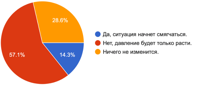 Более 57% респондент_ок уверены, что давление на ЛГБТК+ сообщество в ближайшие годы будет только расти. Еще почти 29% полагают, что ситуация законсервируется и ничего не изменится. В сумме это дает подавляющее большинство — свыше 85% опрошенных, которые не видят легальных перспектив для активизма и защиты своих прав внутри страны в обозримом будущем. На этом фоне лишь 14% сохраняют надежду на то, что ситуация начнет смягчаться.