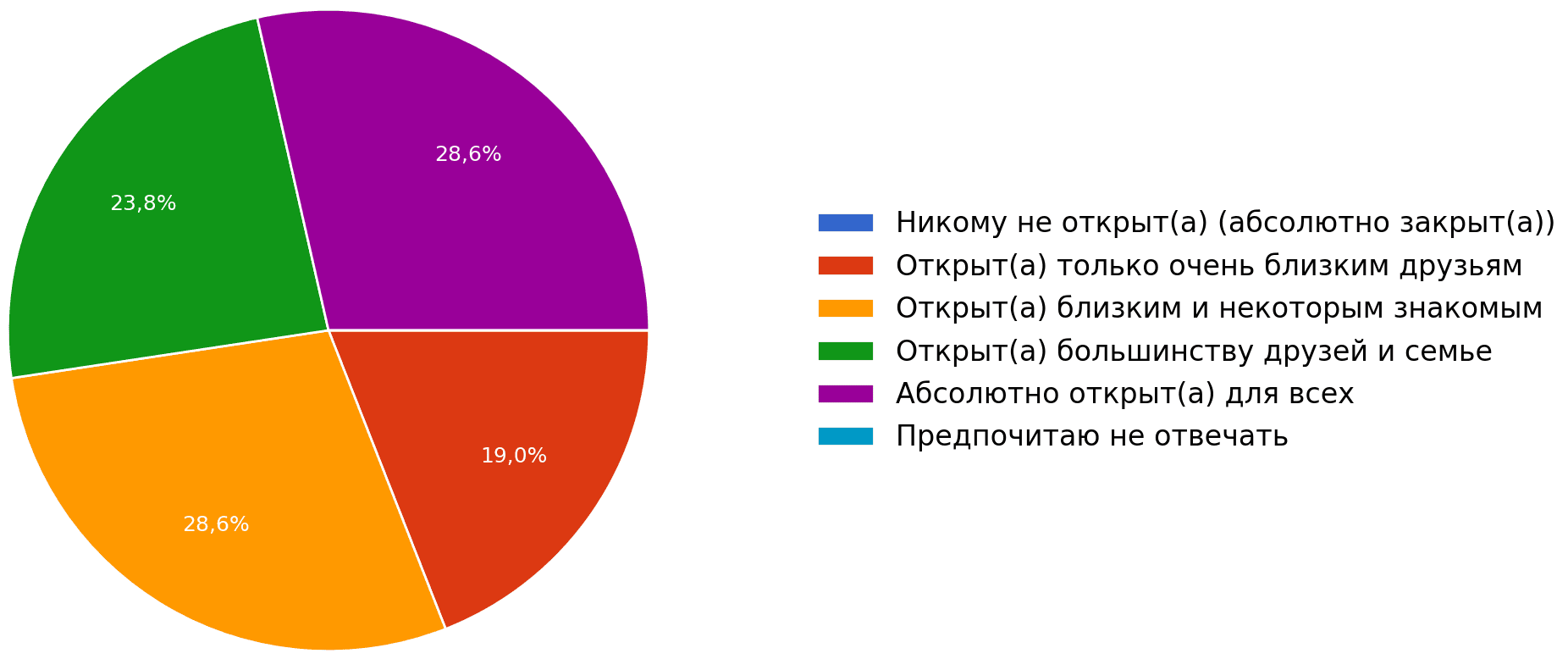 Согласно данным опроса, полностью открыто могут жить лишь 28,6% респондент_ок. Для остальных публичное пространство остается зоной опасности. Каждый пятый (19%) доверяет информацию о своей идентичности только самым близким друзьям.